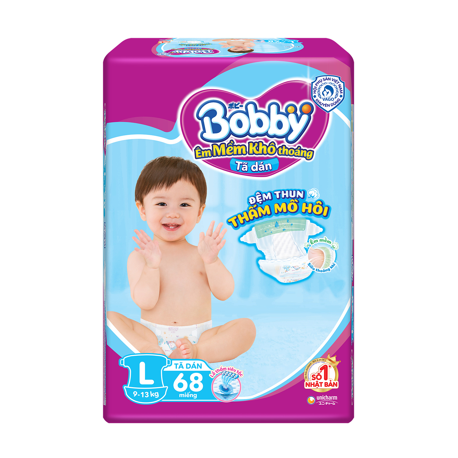 Tã dán Bobby size L có bề mặt tã dạng sóng với vô số rãnh thấm hút siêu nhanh, thoáng khí, đồng thời giảm tiếp xúc với chất bẩn cho mông bé khô thoáng.