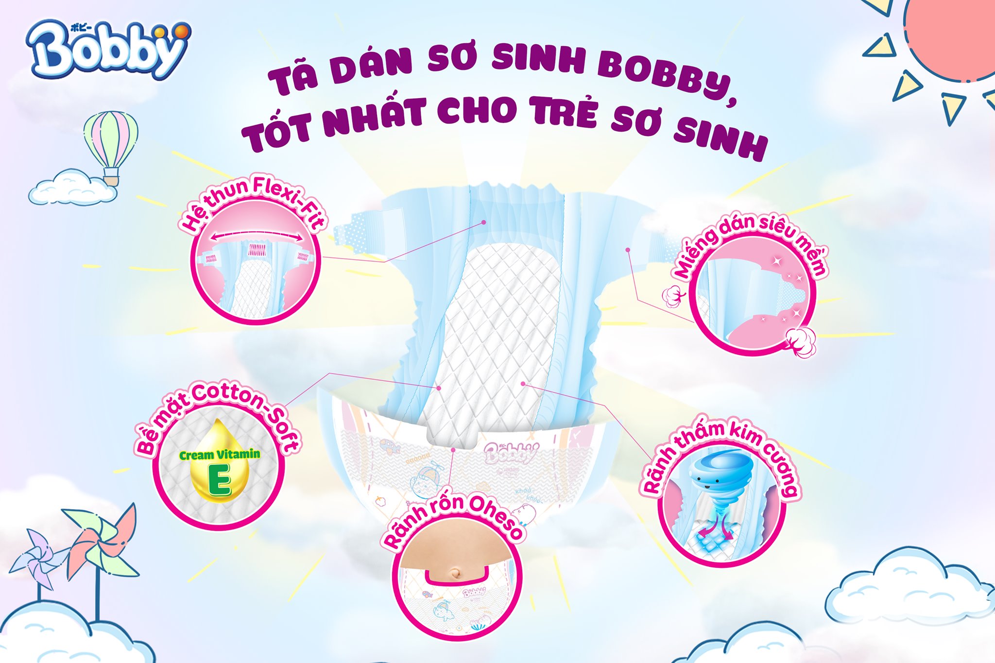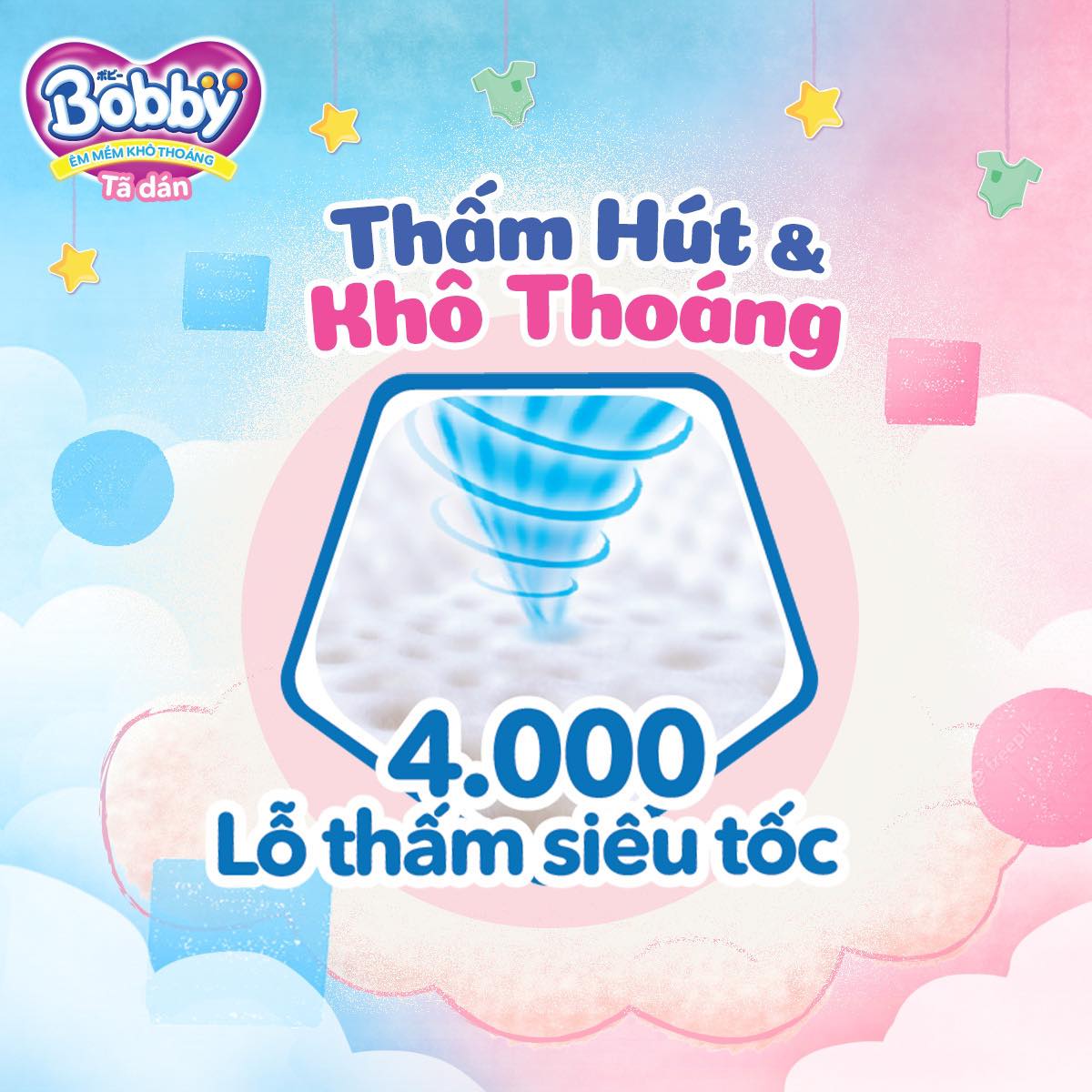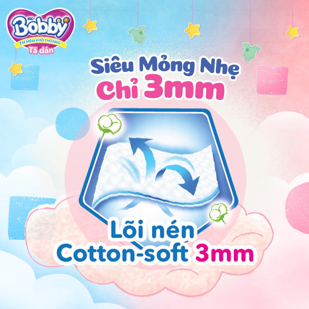 Tã dán Bobby size S (4-8 kg) với Công nghệ ép lõi Cotton-soft siêu mỏng nhẹ chỉ 3mm, tã siêu mỏng, giúp tăng cường tốc độ thấm hút và mềm dịu cho làn da bé sơ sinh