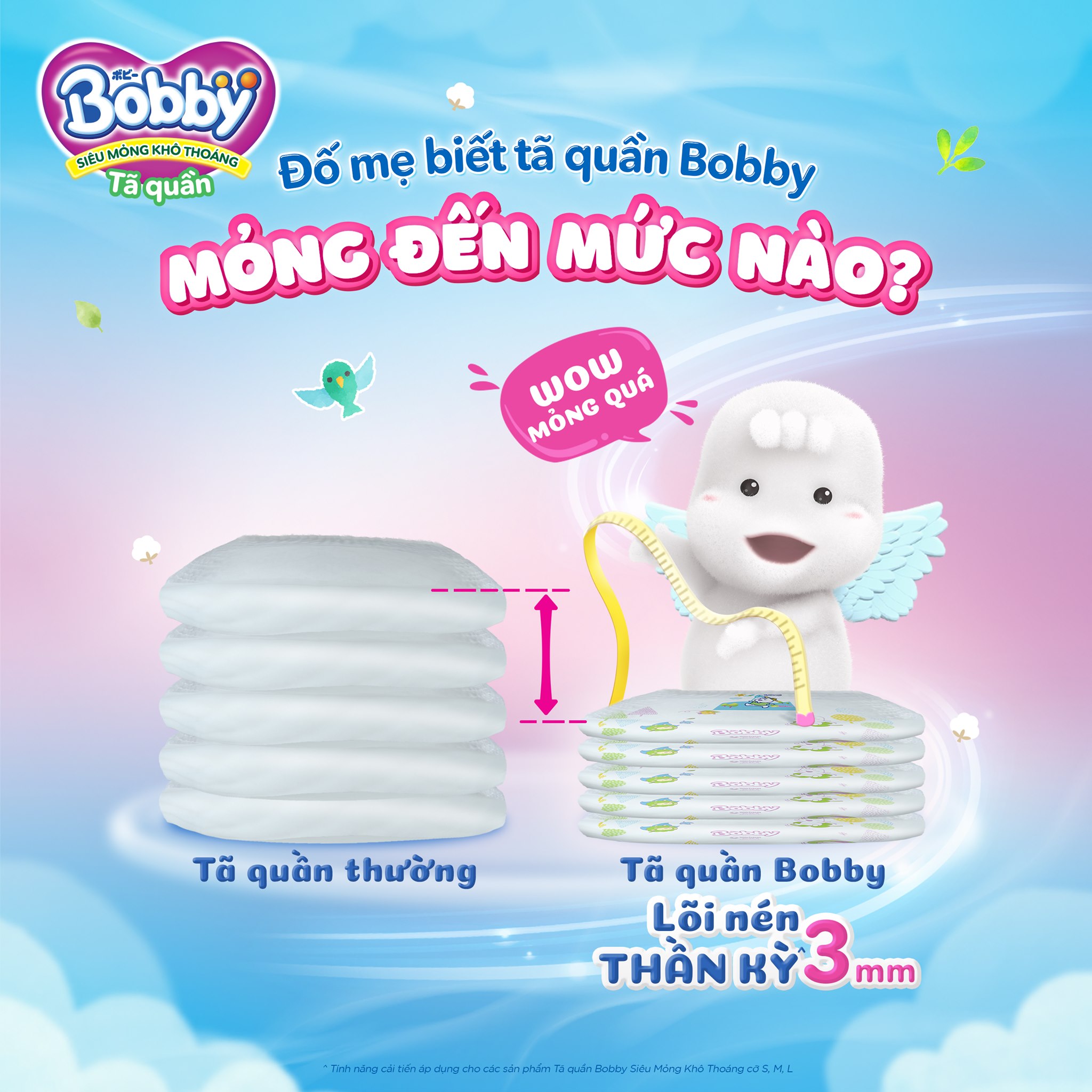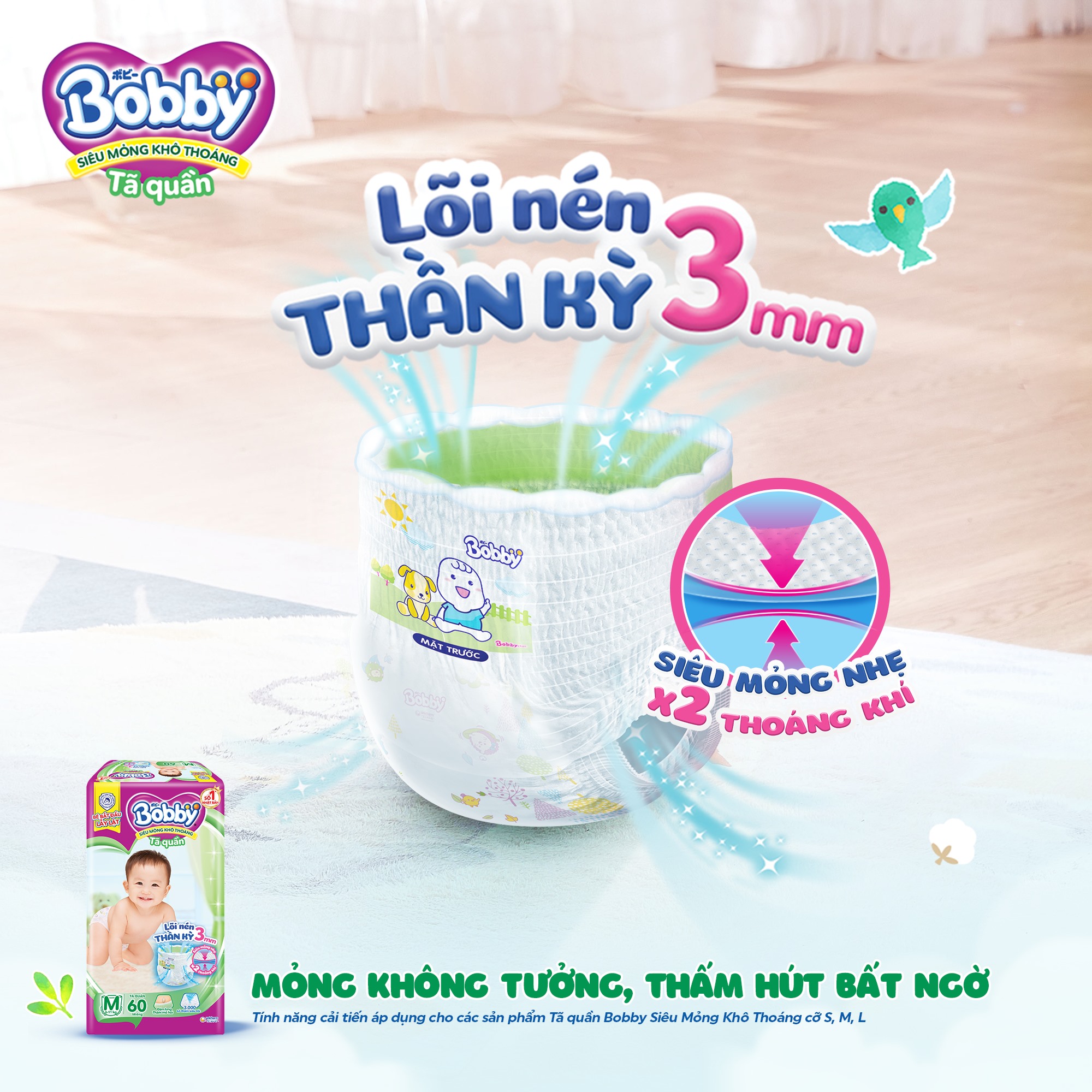 Tã quần Bobby size L 68 miếng sở hữu cải tiến mới: với Công nghệ ép lõi đặc biệt sáng tạo nên Lõi nén thần kỳ 3mm, giúp tã siêu mềm, mỏng mà thấm hút vượt trội, tuyệt đối không vón cục, đồng thời thoáng khí gấp 2 lần (*) mà vẫn thấm hút lượng lớn nước tiểu