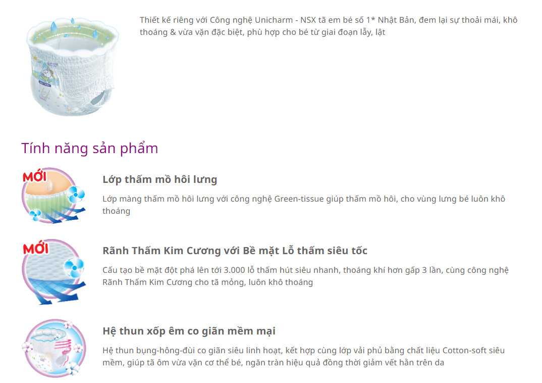 Cấu tạo bề mặt đột phá lên tới 3.000 lỗ thấm siêu nhanh, cho tã luôn khô ráo và thoáng khí từ trong ra ngoài