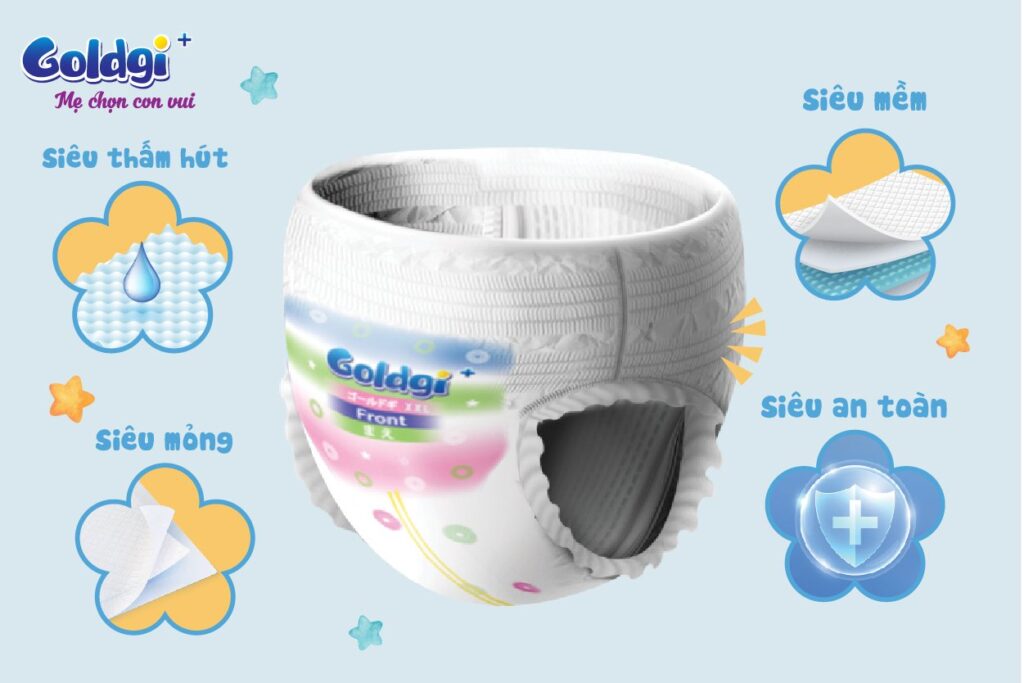 Tã quần Goldgi+ size L nổi bật với thiết kế siêu mỏng, chỉ 1.5mm, phù hợp sử dụng cả mùa hè lẫn mùa đông, mang đến cho bé những vận động thoải mái