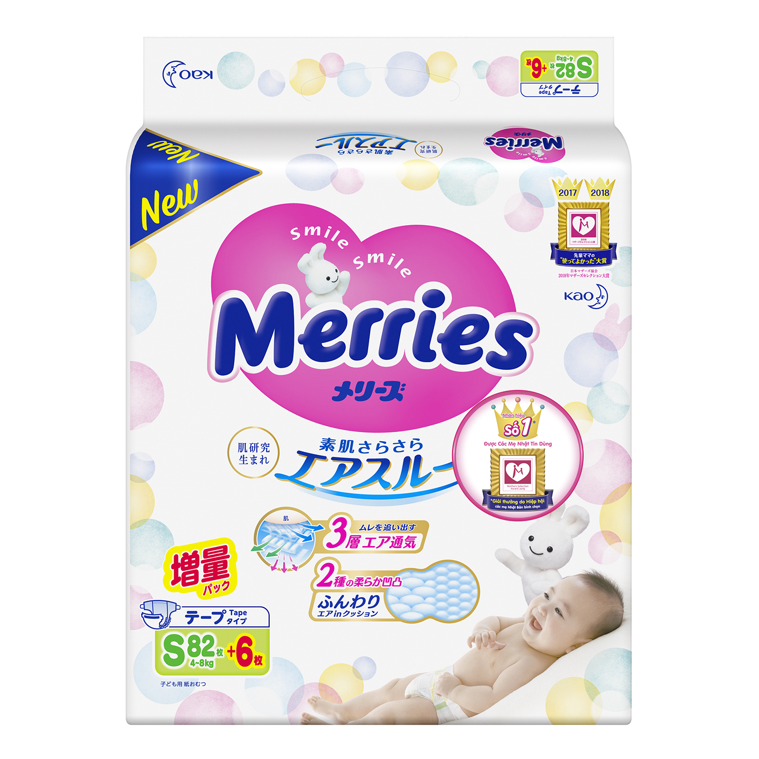 Tã dán Merries size S cấu trúc đặc biệt với 3 lớp siêu thoáng khí: