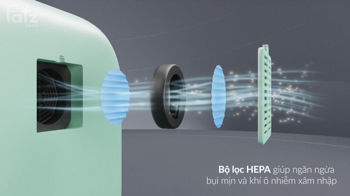 - Lọc khí HEPA giúp ngăn ngừa khí độc và khí ô nhiễm: đây là chiếc máy đầu tiên của FATZBABY đươc đầu tư màng lọc này, dành cho các gia đình e ngại về sự ô nhiễm không khí nơi mình đang sống. Lọc khí sẽ được đặt ở cửa khí vào và ra đảm bảo khí trong máy tuyệt đối sạch không nhiểm bụi cũng như các chất độc hại trong không khí.