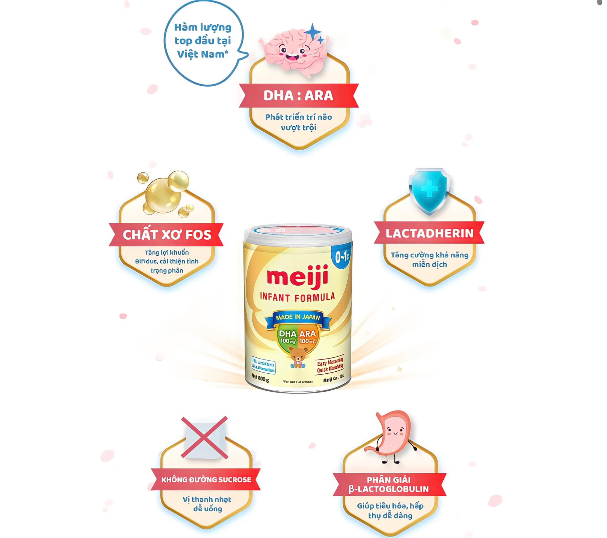 Sữa Meiji Infant Formula được sản xuất theo nghiên cứu dành cho trẻ em Việt Nam trên dây chuyền hiện đại của Nhật Bản, hoàn toàn tự động, đạt tiểu chuẩn ISO 9001. Cung cấp đầy đủ dưỡng chất, vitamin, khoáng chất cần thiết giúp trẻ phát triển toàn diện nhất