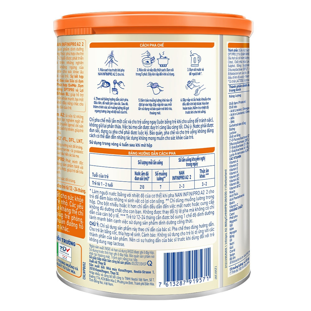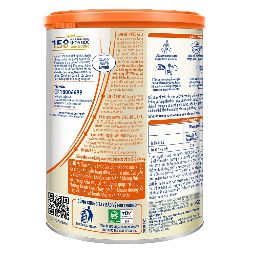 - Sữa Nan Infinipro A2 số 2 chứa hàm lượng sữa A2 tách kem 29% và đạm chất lượng Optipro 21%, đáp ứng nhu cầu của trẻ trong giai đoạn từ 1 - 2 tuổi.