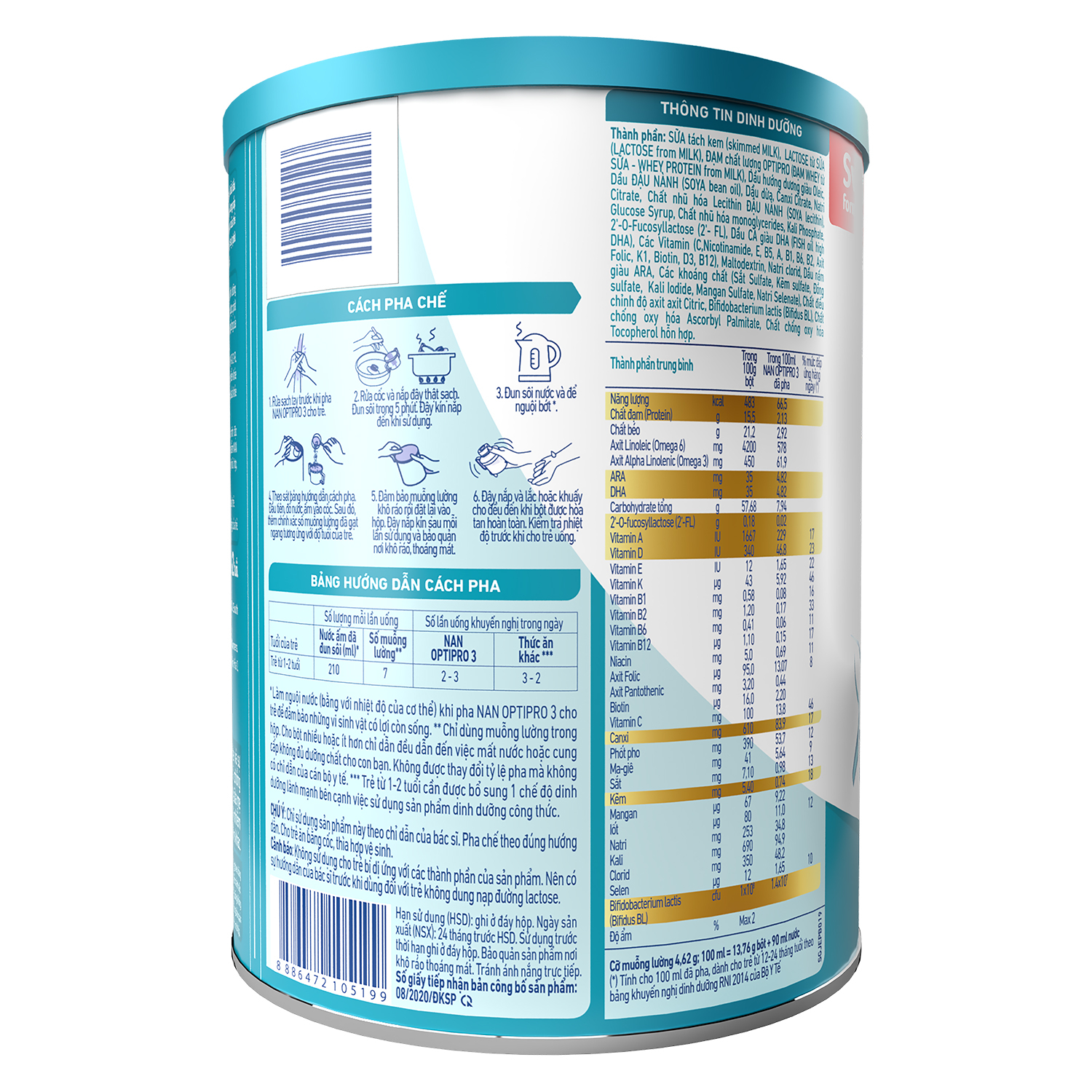 Sữa Nan Optipro số 3 là sản phẩm dinh dưỡng công thức từ Thụy Sĩ, bổ sung các dưỡng chất thiết yếu giúp hỗ trợ tiêu hóa, tăng cường sức đề kháng của trẻ. Công thức dinh dưỡng Nestlé Nan Optipro 3 từ Thụy Sĩ chứa: