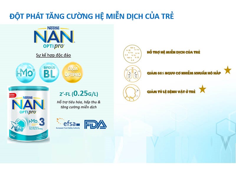 Nestlé Nan Optipro 3 được chứng nhận an toàn cho trẻ bởi FDA (Cục Quản lý Dược phẩm & Thực phẩm Hoa Kỳ) và EFSA (Ủy ban ATTP Châu Âu)