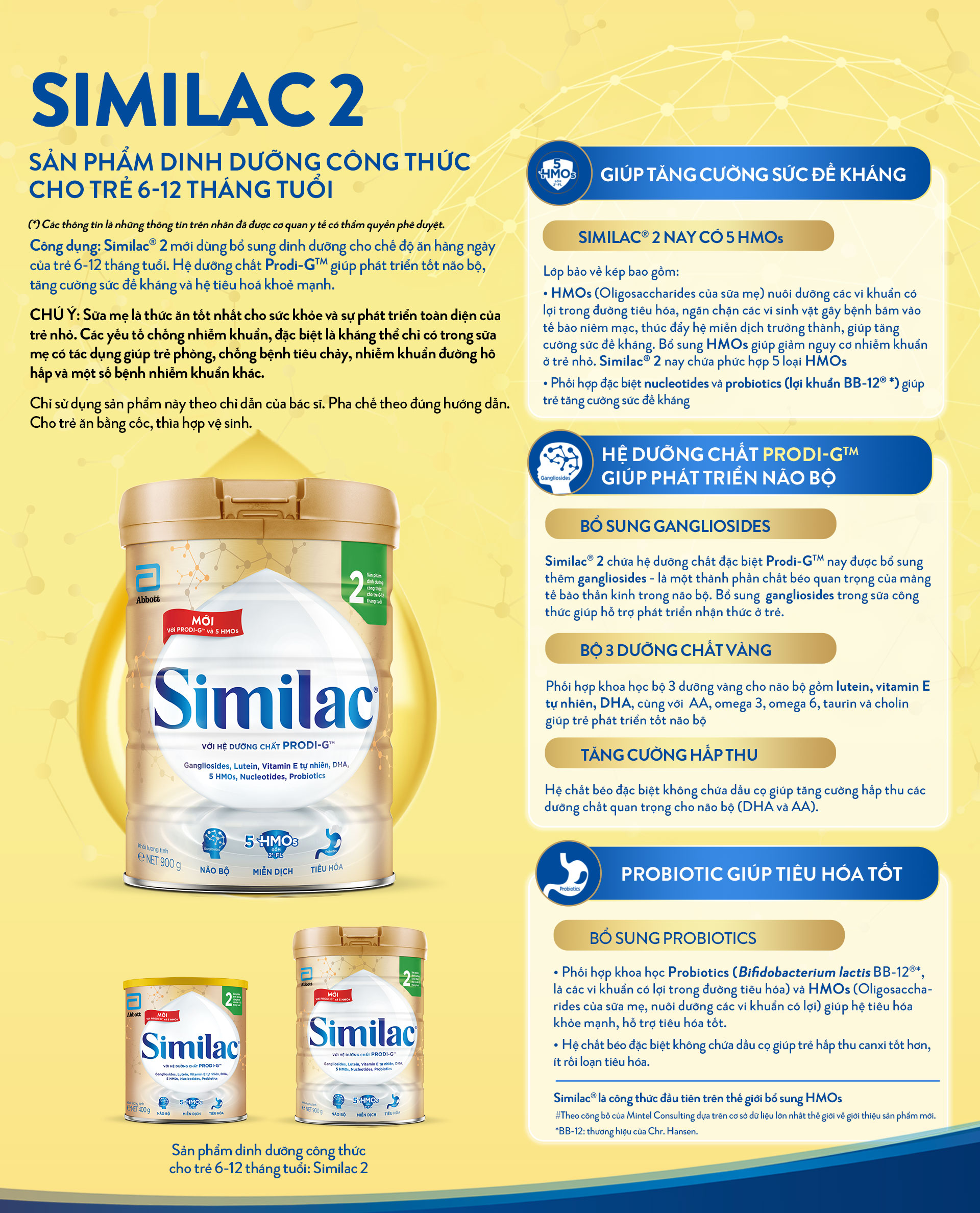 - Similac® 2 chứa hệ dưỡng chất đặc biệt Prodi-GTM nay được bổ sung thêm gangliosides - là một thành phần chất béo quan trọng của màng tế bào thần kinh trong não bộ giúp hỗ trợ phát triển nhận thức ở trẻ.