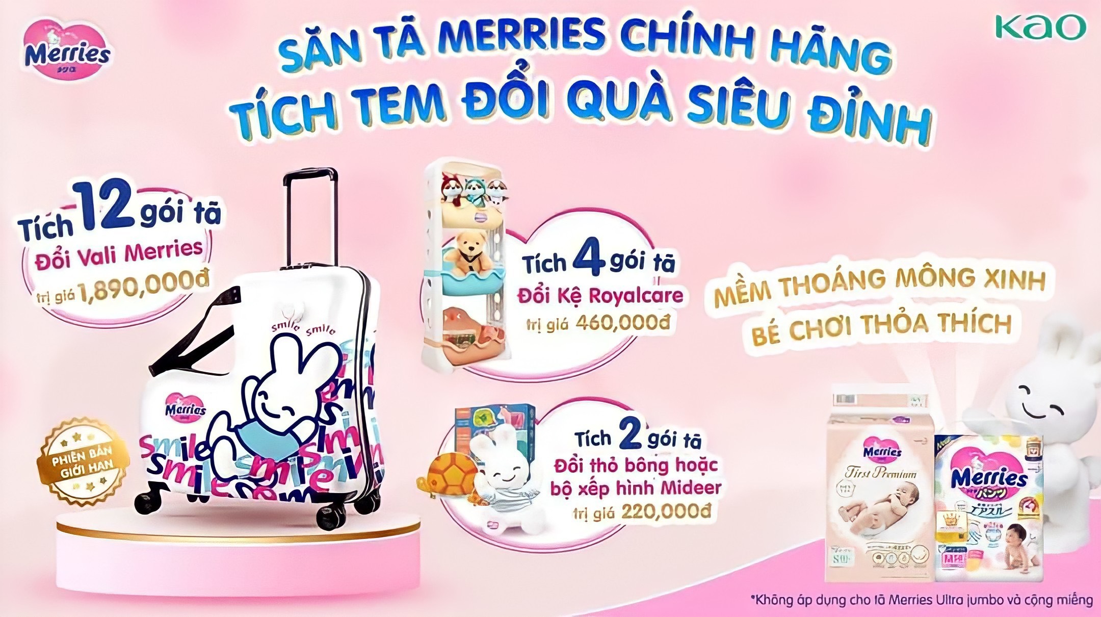 Tích luỹ 12 mã QR (tương đương 12 gói tã) đổi lấy 1 Vali Merries (phiên bản giới hạn trị giá 1.890.000đ) cho bé vui vi vu khám phá.