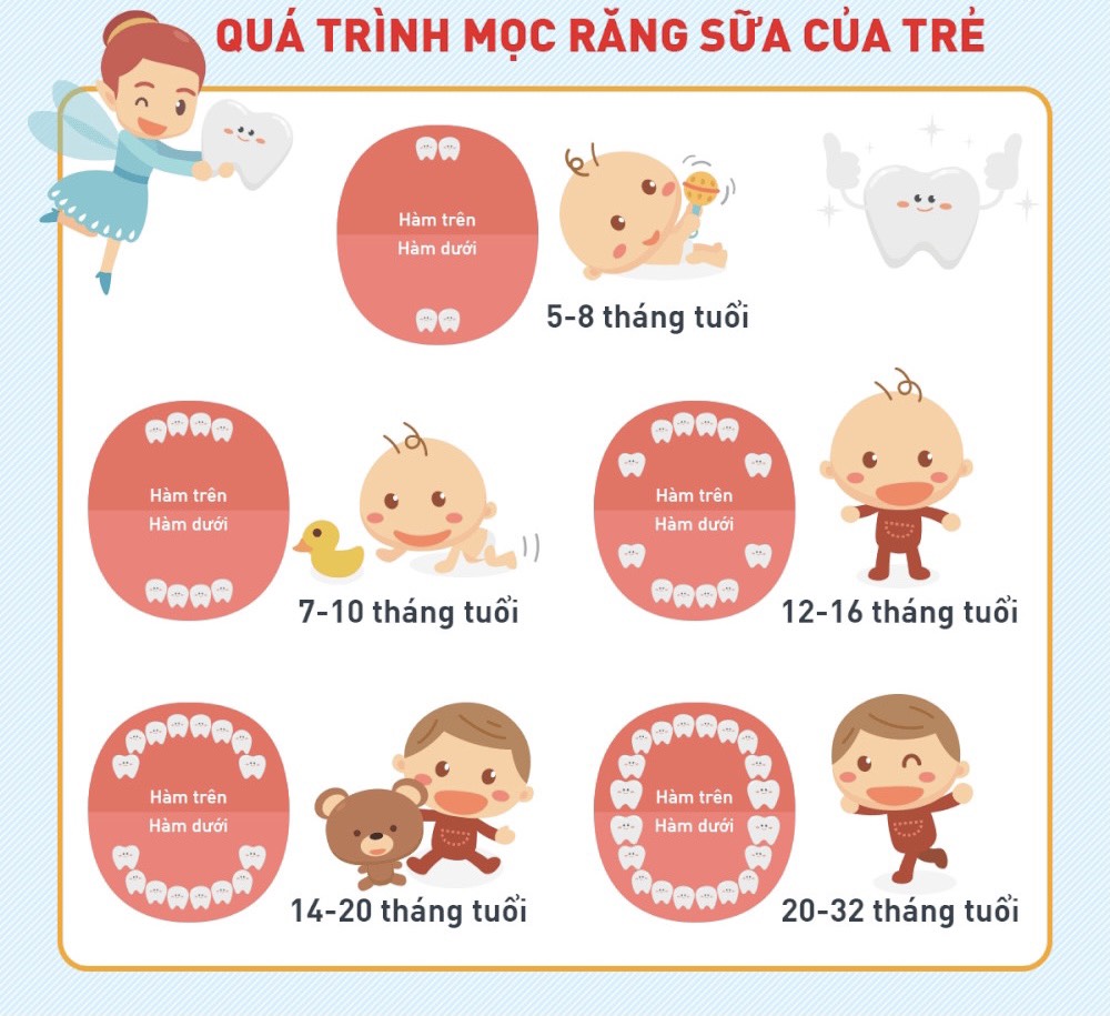 Đa số các trẻ sẽ mọc răng sữa khi được khoảng 4-7 tháng tuổi và mọc đủ 20 chiếc răng sữa trong khoảng từ 2 tuổi rưỡi đến 3 tuổi. Cụ thể: